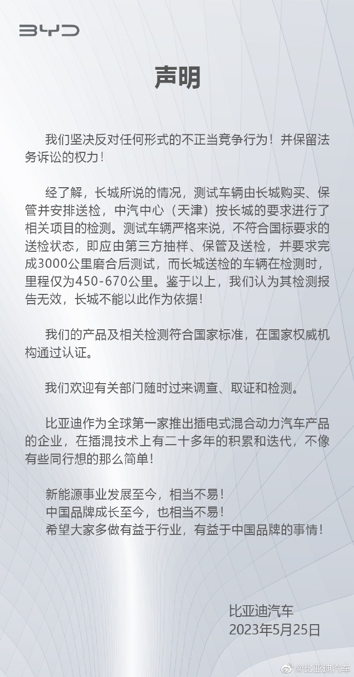 对此,比亚迪方面回应称,经了解,长城汽车所说的情况,测试车辆由长城汽车购买、保管并安排送检,中汽中心(天津)按长城汽车的要求进行了相关项目的检测。测试车辆严格来说,不符合国标要求的送检状态,即应由第三方抽样、保管及送检,并要求完成3000公里磨合后测试,而长城汽车送检的车辆在检测时,里程仅为450公里~670公里。鉴于以上,比亚迪方面认为长城汽车的检测报告无效。同时,比亚迪还在声明中表示,坚决反对任何形式的不正当竞争行为,并保留法务诉讼的权利,呼吁“多做有益于行业、有益于中国品牌的事情!”