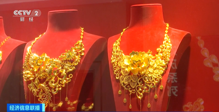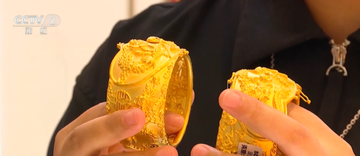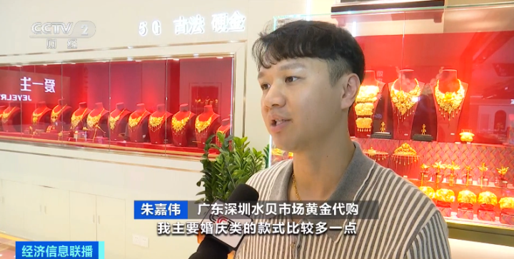 广东深圳水贝市场黄金代购 朱嘉伟:代购量比去年增加40%到50%左右,我主要是婚庆类的款式比较多,像有手镯、戒指、耳钉等的一个套装,每个月有一两百套左右,基本每套都是上百克。