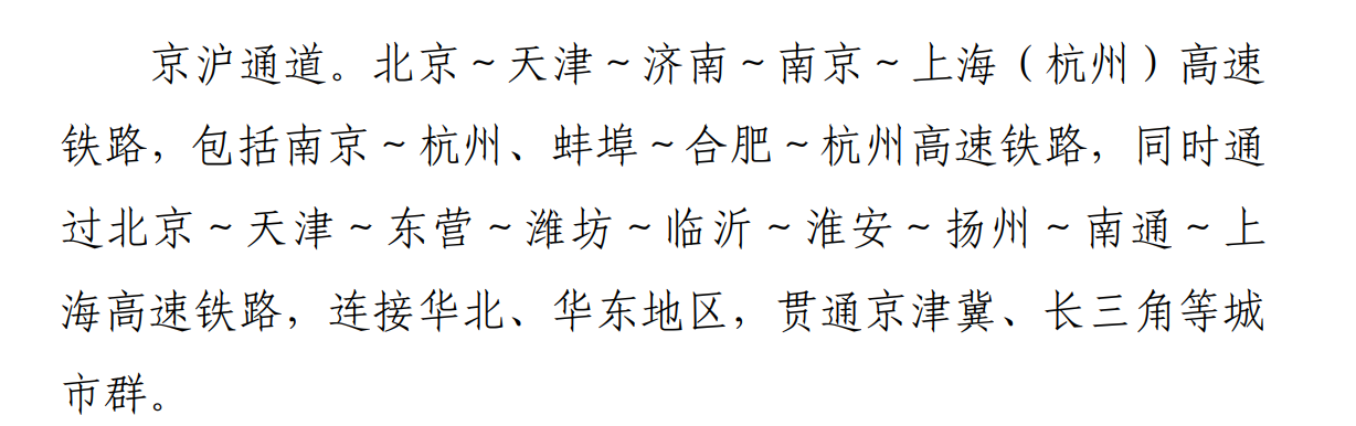 据2016年修订的《中长期铁路网规划》显示,京沪通道是“八纵”之一。京沪通道包括两条线路,其中一条为京沪高铁,走向为北京-天津-济南-南京-上海(杭州)高速铁路,包括南京-杭州、蚌埠-合肥-杭州高速铁路。另一条为京沪辅助通道,通过北京-天津-东营-潍坊-临沂-淮安-扬州-南通-上海高速铁路,连接华北、华东地区,贯通京津冀、长三角等城市群。