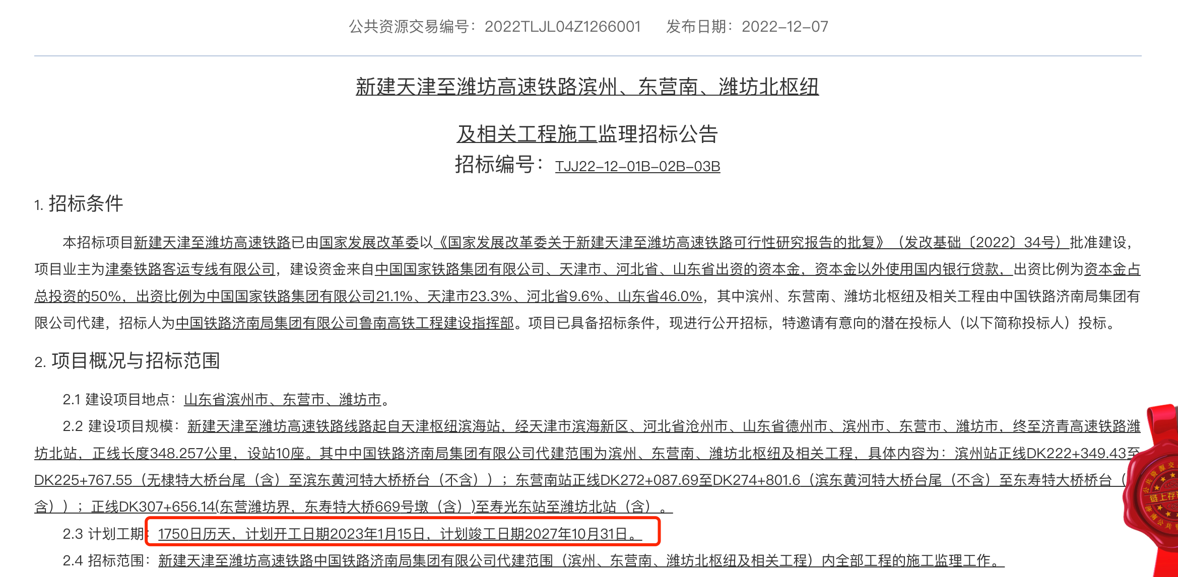 津潍高铁建设计划方面,预计将于2027年10月底竣工。据去年12月7日济南公共资源交易平台发布的“新建天津至潍坊高速铁路滨州、东营南、潍坊北枢纽及相关工程施工监理招标公告”显示,京沪高铁二线津潍段将计划于2023年1月15日开工,并于2027年10月底竣工。