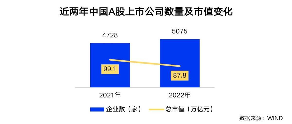截至2022年底,我国A股上市公司数量达到5075家,较2021年的4728家增加347家,增幅达7.3%。同时,在经济增速放缓的宏观形势下,上市公司总市值有所收缩,从2021年的99.1万亿元,下降到2022年的87.8万亿元,同比下降11.4%。