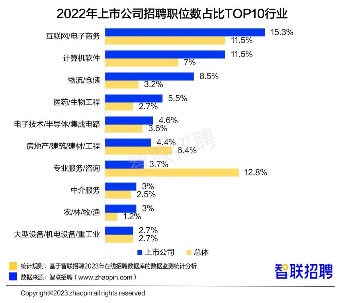 从行业看,2022年上市公司招聘规模前五的行业分别为:互联网/电子商务、计算机软件、物流/仓储、医药/生物工程、电子技术/半导体/集成电路。