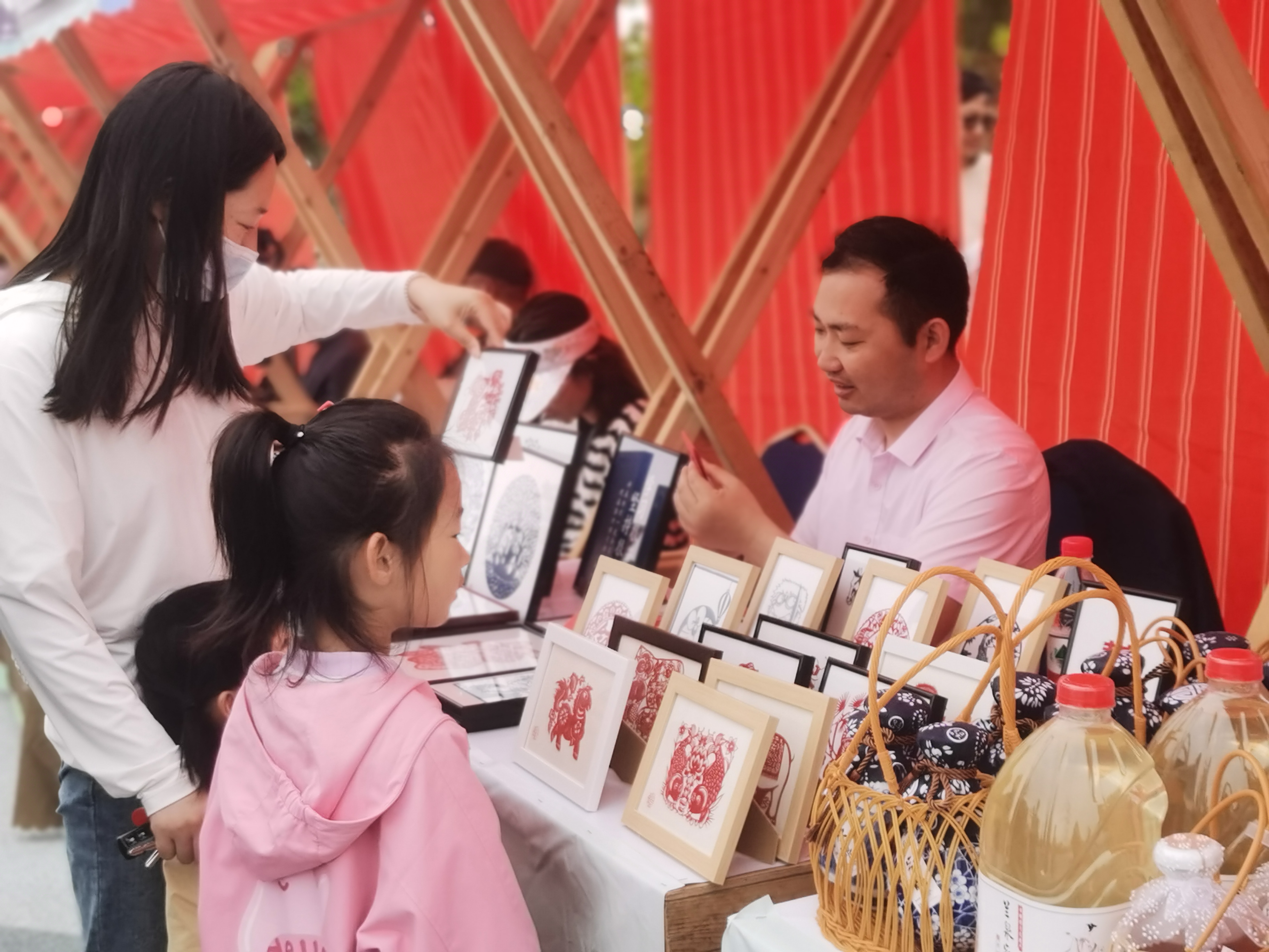 南通棕编制作技艺,长嘴壶茶艺,南通剪纸技艺……当地非遗文化现场展陈,让市民尽情游览;草鞋底,唐家闸米酒,南通糖画,各色地方美食一字排开,让你感受富有南通特色的人间烟火气;樱桃、西瓜等时令水果现场邀游客现场品尝,给盛夏增添了不少清凉气息。当日的乡村旅游集市,许多市民游客合家出游,开启快乐“逛吃”模式。