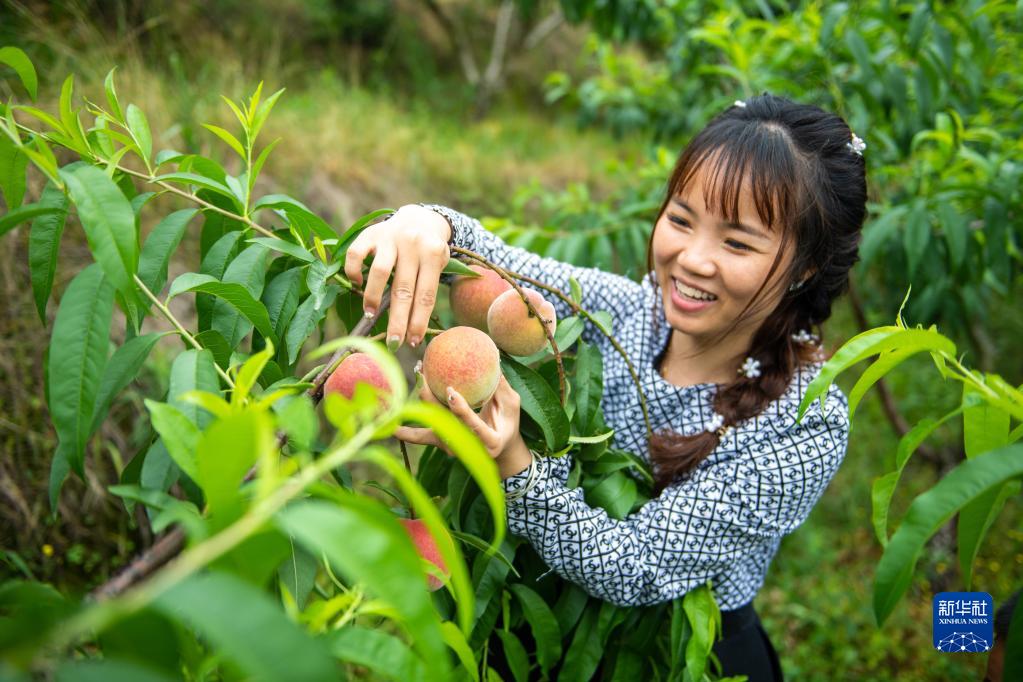 6月3日,在冷水江市铎山镇岩口村红珠岭鲜桃基地,游客在采摘桃子。新华社记者陈思汗摄