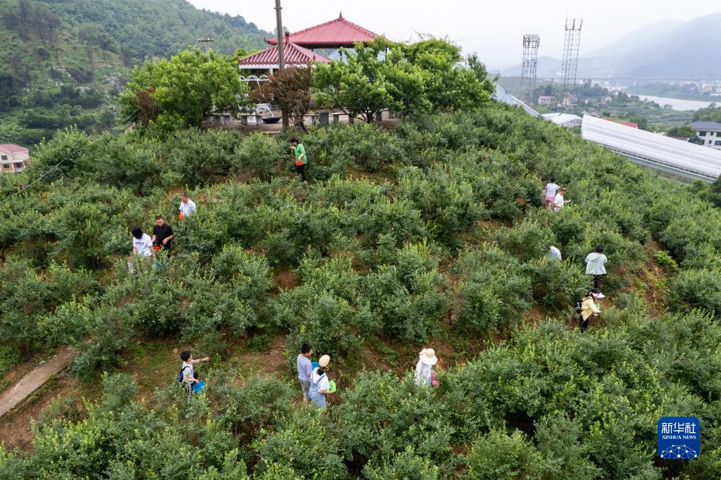 6月3日,在冷水江市金竹山镇新田村蓝莓基地,游客在采摘蓝莓(无人机照片)。新华社记者陈思汗摄