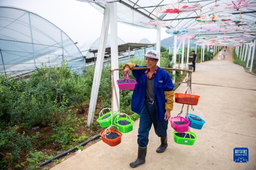 6月3日,在冷水江市金竹山镇新田村蓝莓基地,果农运输准备销售的蓝莓。新华社记者陈思汗摄