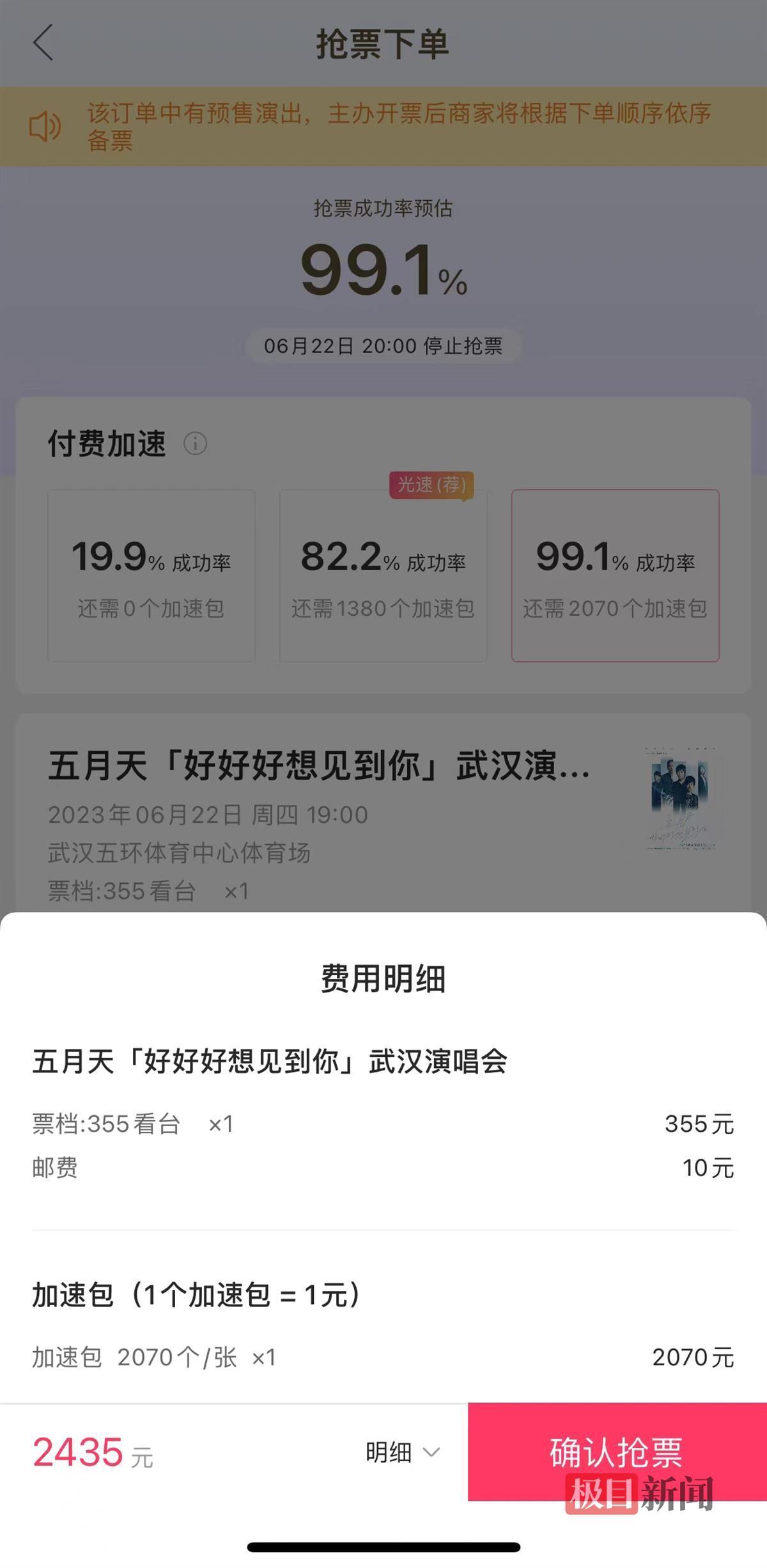 极目新闻记者打开摩天轮APP“五月天武汉演唱会”页面看到,有普通抢票、快速抢票、极速抢票3种抢票方式,每种搭售的加速包数量不同,单个加速包售价10元,买得越多机会越大。