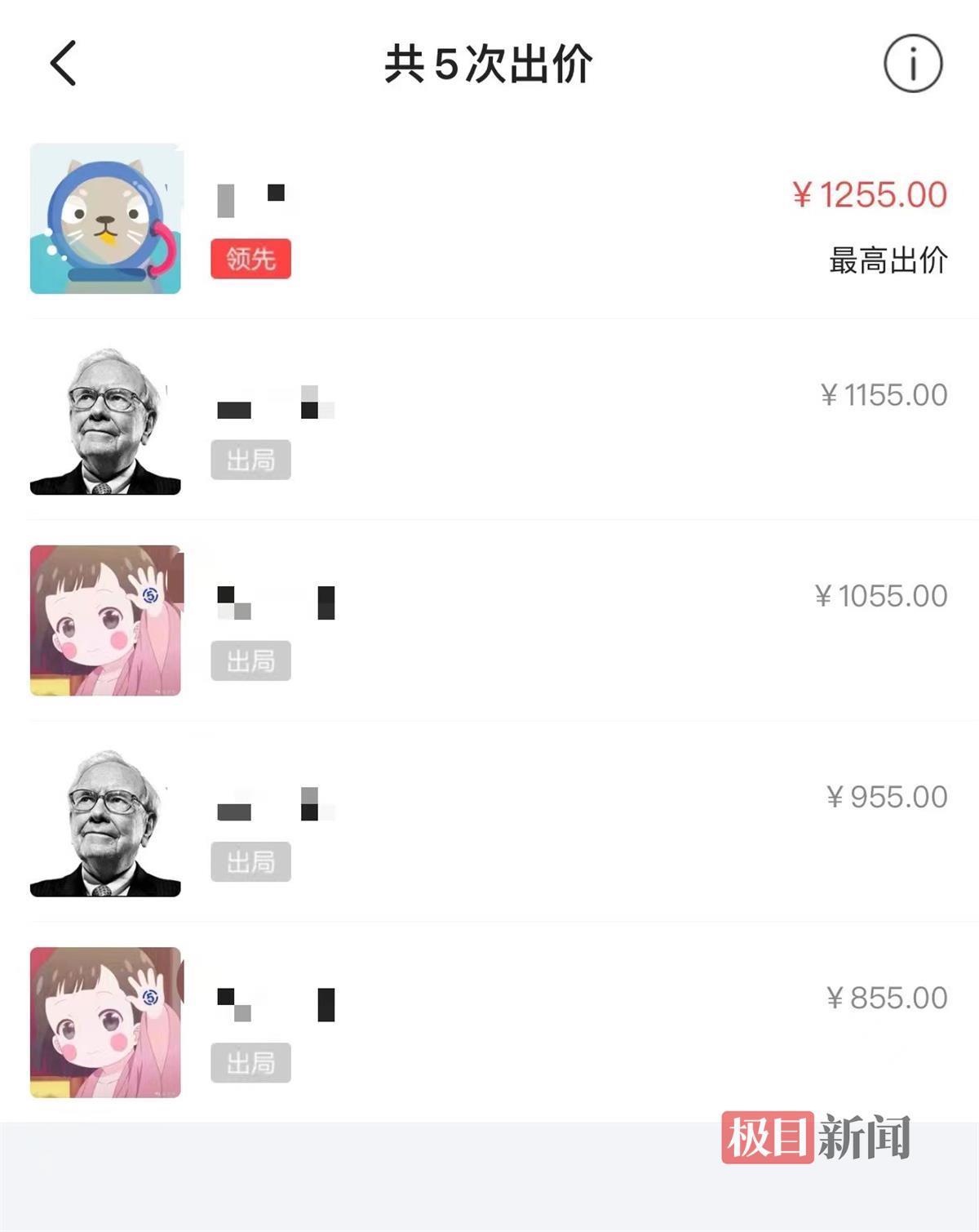 记者在二手平台上看到,还有“路人黄牛”将自己抢来的门票以拍卖形式转售,买家竞价、价高者得。票面价855的门票,几位买家出价后,最高出价目前达1255元。