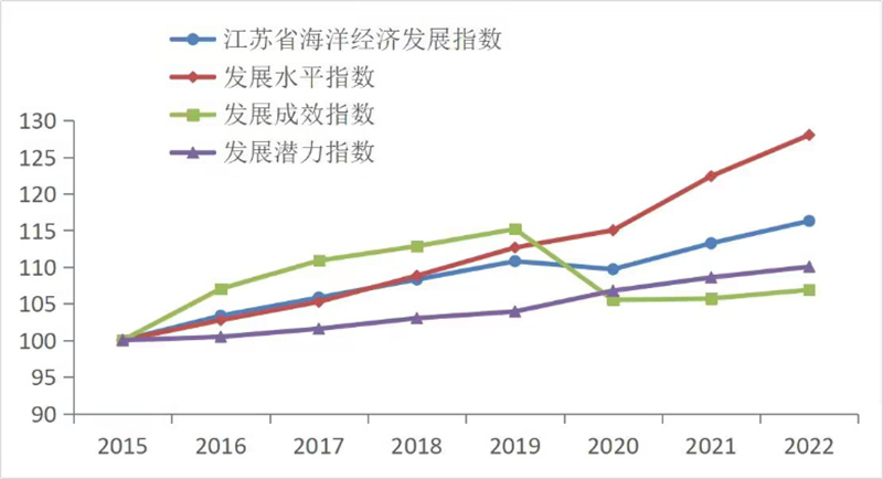 分三个维度来看:2022年发展水平指数为128.0,比上年增长4.6%,江苏海洋生产总值超9000亿元,海洋经济规模再上新台阶,质量效益稳步提高。2015—2022年,发展水平指数年均增速3.6%,发展基础不断夯实。2022年发展成效指数为106.9,比上年增长1.1%,民生保障有力,沿海居民生活质量不断改善。2015—2022年,发展成效指数年均增速1.0%,呈现稳中有进态势。2022年发展潜力指数为110.0,比上年增长1.3%,海洋科技创新驱动持续深化,海洋生态环境状况稳中趋好。2015—2022年,发展潜力指数年均增速1.4%,支撑作用不断巩固。