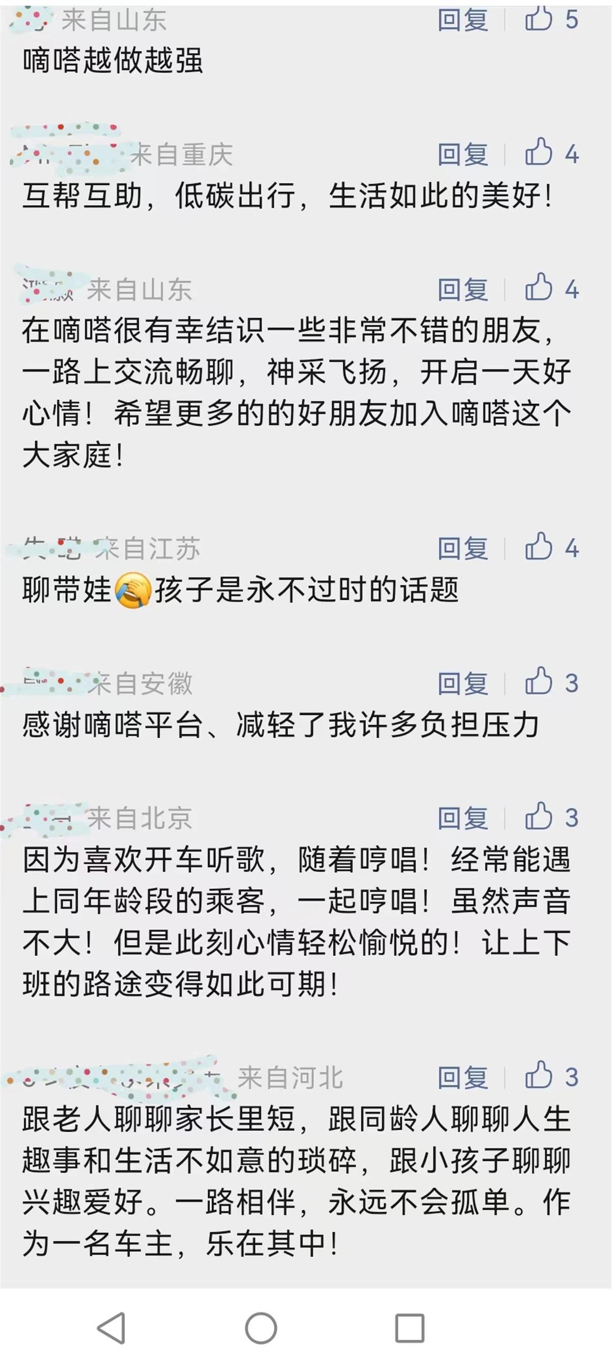 一位嘀嗒顺风车用户表示,“同路人之间可以聊的话题很多,小到生活琐事趣事,大到国际新闻大事,让一次普通的行程也增添了更多乐趣。”