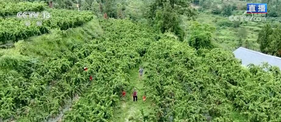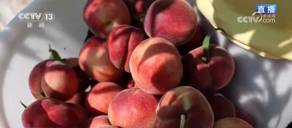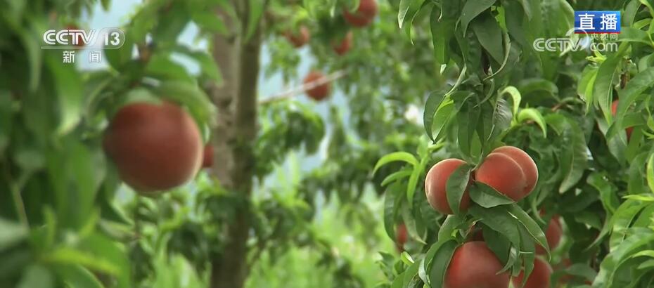总台记者史超杰:通过航拍画面可以看到,入夏后,我周围的这片群山已是满眼的绿色,而这2000亩的桃园就位于比较平缓的山坡上。在我身旁,鲜红的水蜜桃沉甸甸地压弯了枝头。作为桃园里最早成熟的品种,水蜜桃的个体并不算大,每颗重量大约在三两到四两,但是甜度还是比较高,达到了十多度。2019年种下这片桃林后到现在已经是第四年,这片桃树林到了丰产期。