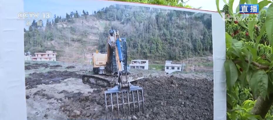 看着如此的丰收景象,很难想象,在2018年以前,这里还是连片的荒山,山上遍布大小石块。我们看一下当时的照片,山头上长满了荒草。村民告诉我,因为土地贫瘠,还存在石漠化的情况,以前这里种植的玉米、红薯等传统作物产量都很低,村民们大多外出打工,土地撂荒严重。2018年,当地推进石漠化治理工作,土地中的石块被这样器械大爪子清理出来,在每亩土地上覆盖约两吨的腐熟有机肥,显著提升了土壤活性,让原本板结的土地变得疏松且肥沃。另外,通过高厢起垄,进一步增加了供给桃树的肥力。