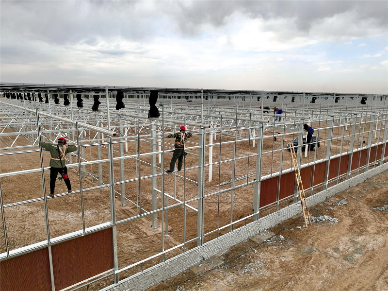 在内蒙古现代数字农业科技有限公司达拉特旗现代数字农业科技产业园项目建设现场,正在进行玻璃铝合金框和轻钢柱的安装,施工人员佩戴安全帽,身穿工作服,腰系安全带,在轻钢柱构架上来回穿梭,紧张有序地忙碌着,一派如火如荼的建设景象。