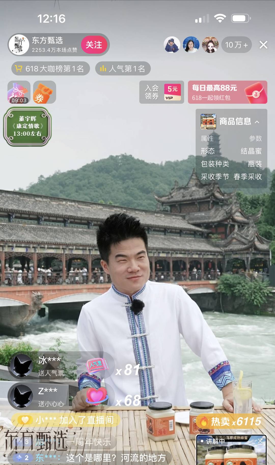 6月9日中午12时刚过,都江堰南桥附近的户外直播间里,东方甄选知名主播董宇辉一边喝着柠檬蜂蜜水,一边为网友介绍起产自四川省凉山彝族自治州的苕子花蜂蜜,从蜂蜜的功能,到产地的海拔,董宇辉延续了一贯娓娓道来的讲解风格,吸引着无数网友下单购买。