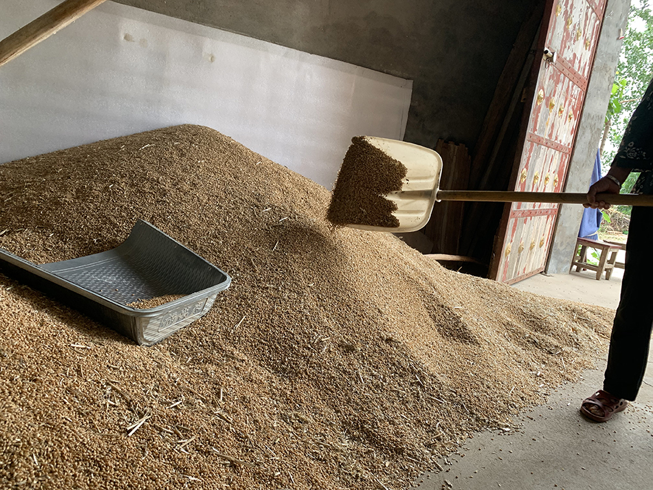 她把空地上发霉的麦穗一把抱起,准备回去喂鸡。他们家的11亩地,有四亩是从兄弟那承包过来的,每年一亩地租金300元,算村里租金最便宜的,但今年每亩地还是要亏上三四百元。