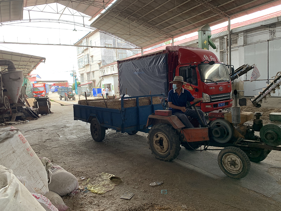 距离村里最近的粮食收购点的工作人员说,今年收购的小麦价格最高的一元/斤,五六毛/斤也很常见。粮食收购点内,烘干塔24小时作业,发出阵阵轰鸣声,开铲车的师傅以一次2000斤的供应量将麦子送入烘干塔的主机。一旁的粮食商说:“往年9月份收玉米的时候,烘干塔才作业,今年提前了3个月。”