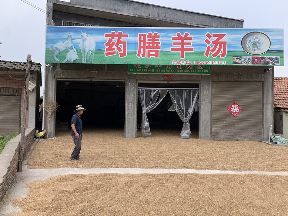 6月7日,一位村民在侄子关停的羊汤馆前赤着脚踩麦子。