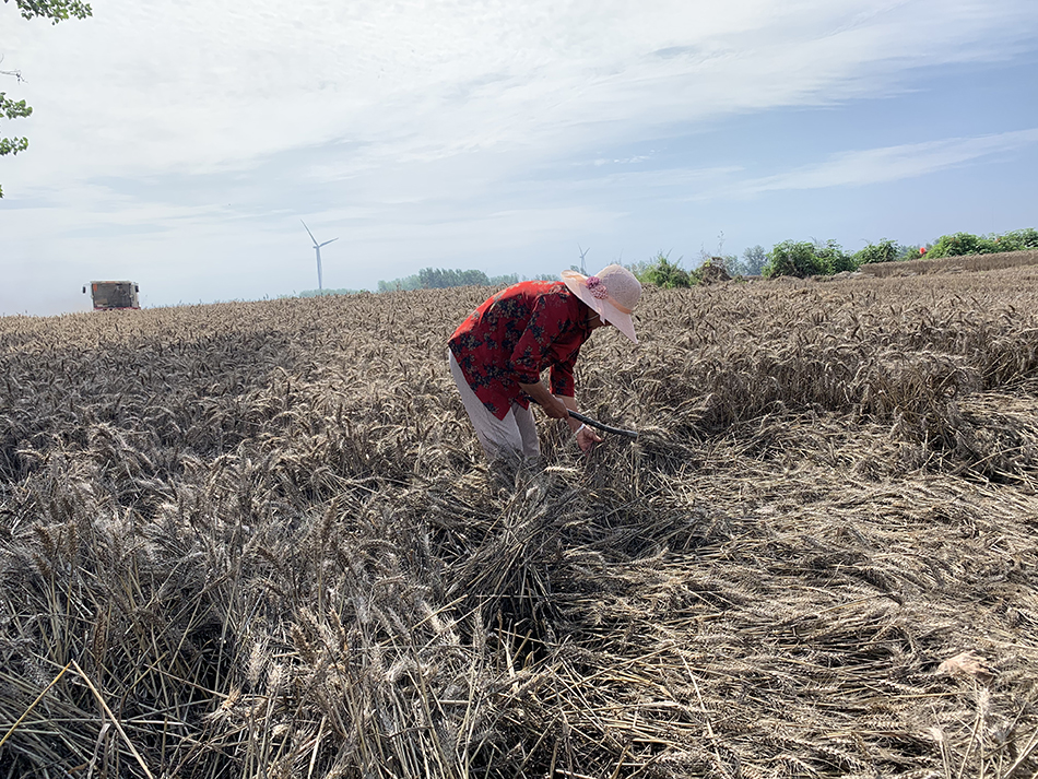 6月7日,村民赵香梅在查看刚收割的麦子。
