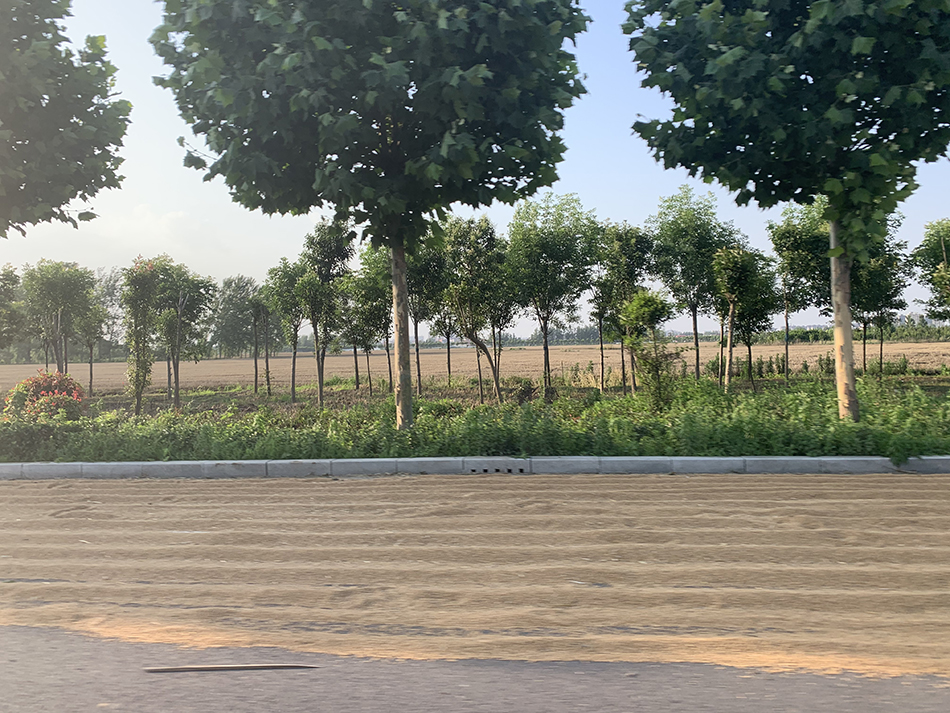 从河南周口东站上车,去往驻马店市上蔡县朱里镇周赵村,沿途50多公里的公路两边晒满了农户刚从“烂场雨”中抢收回来的小麦。为了避免麦子被车轮碾轧,农户们找来树枝、戒尺、白酒盒等放在交界处,过路的司机默契地给麦子让出一条车道。