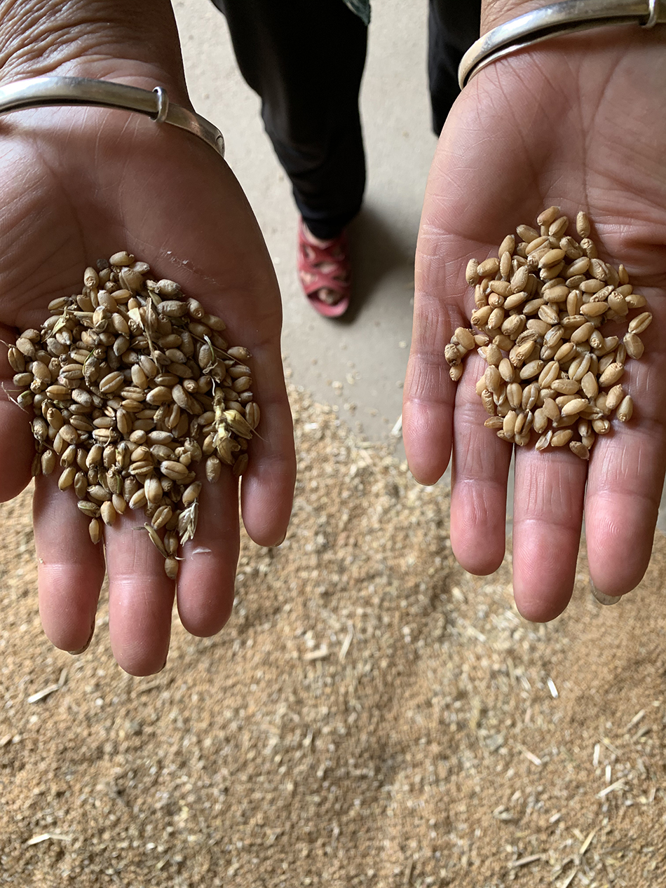 赵瑞英手捧今年的麦子和去年的麦子比较,左边是今年收的,右边是去年收的。