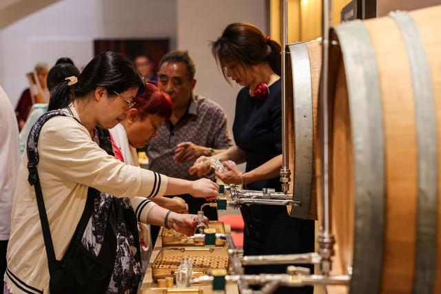 6月12日,游客在张裕酒文化博物馆内体验灌装白兰地酒。新华社记者 朱峥 摄