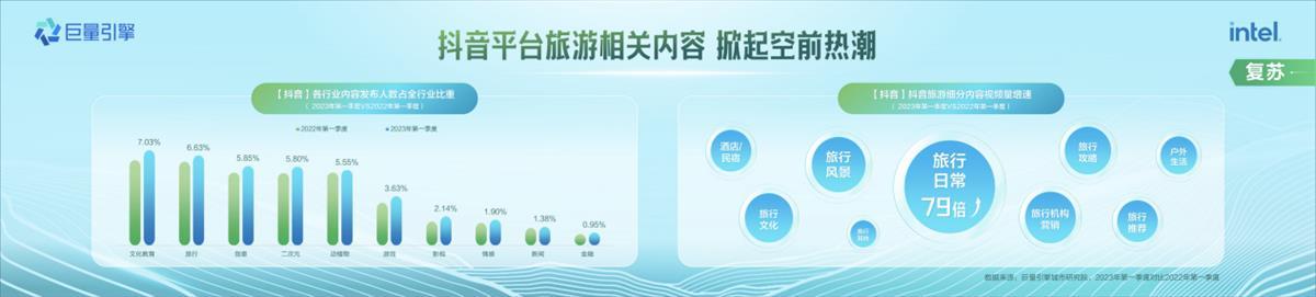 而在短视频平台上,旅游占比也越来越重。以抖音为例,今年一季度,该平台上旅游内容量位居前列。领域在细分的同时内容体量也在不断增长,旅行日常类型增长79倍,最小的增长(户外生活)也有37倍。
