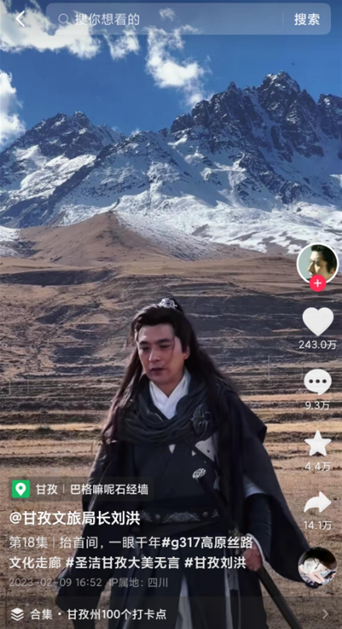 近年来,官方通过抖音带着当地文旅“出圈”的例子不在少数。比如甘孜文旅局长刘洪,在陪同丁真参加活动时被粉丝们发现,他长相酷似“周润发”,通过藏族、古装类视频宣传甘孜文旅风景,截至目前粉丝达到260万+,是甘孜的另一张文旅名片。