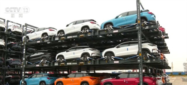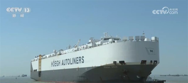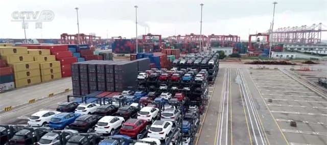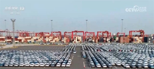 总台央视记者陈俏:这里是江苏的太仓港,我所在的这个地方就是太仓港为了发展汽车外贸而专门打造的汽车滚装码头。现在您看到这里停放的汽车都是从长江中上游港口城市的汽车生产企业运送到这里的整车。