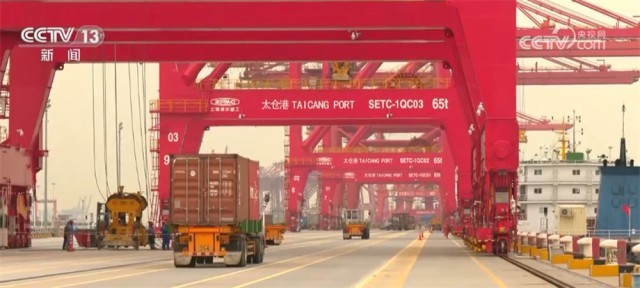 总台央视记者陈俏:这里是江苏太仓港的集装箱码头,现在的时间已经是夜里的12点多了,但是我们看到,在港区的装卸作业仍然是非常繁忙。