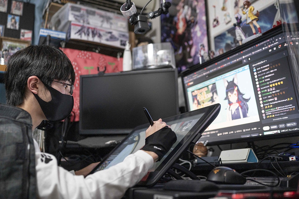 当地时间2022年3月12日,日本横滨,Kazumi在家中为其喜欢的虚拟主播MioOokami制作插图。视觉中国资料图