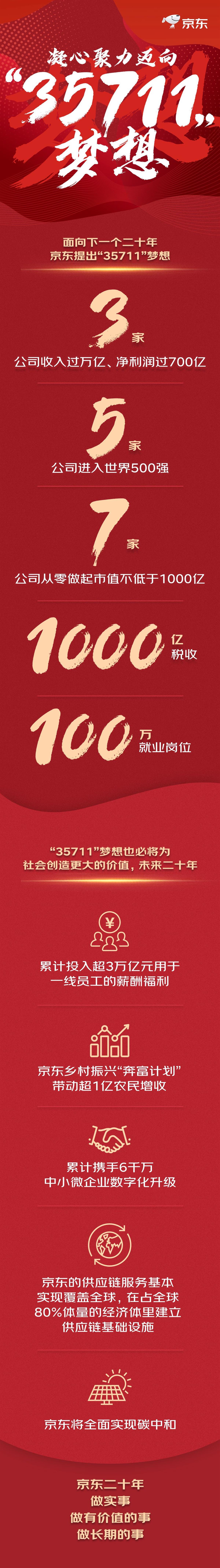 6月18日,京东迎来二十周年。在当天向56万员工发送的《凝心聚力迈向“35711”梦想》全员信中,京东正式提出了面向未来二十年的“35711”梦想:能有3家收入过万亿人民币,净利润过700亿人民币的公司;5家进入世界五百强的公司;7家从零做起市值不低于1000亿人民币的上市公司;能为国家缴纳1000亿人民币税收;提供超过100万就业岗位。