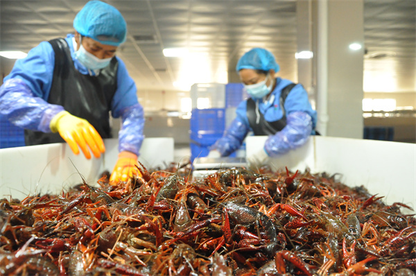 在产业化联合体龙虾加工车间,一筐筐小龙虾经过分拣后,进入蒸煮、冷却、封装、浇料、液氮冷冻等环节,可实现当天生产,当天送达都市消费者餐桌。