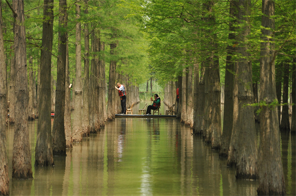 游人乘船游览洪泽湖湿地景区水杉林(央广网发曹童摄)