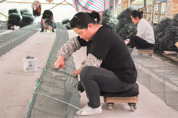 在临淮镇徐圩社区,一处渔具加工点内,十余名居民正在紧张赶制一批渔具。“政府建了大棚,我们在家门口加工渔具,可以自己销售,也可以让渔家公社销售,一个月收入四五千元,真正解决了家门口就业问题。”今年50岁的孙荣兵以前是个渔民,上岸6年来,村子拆迁住进了楼房,自己和乡亲们也在家门口实现了灵活就业。