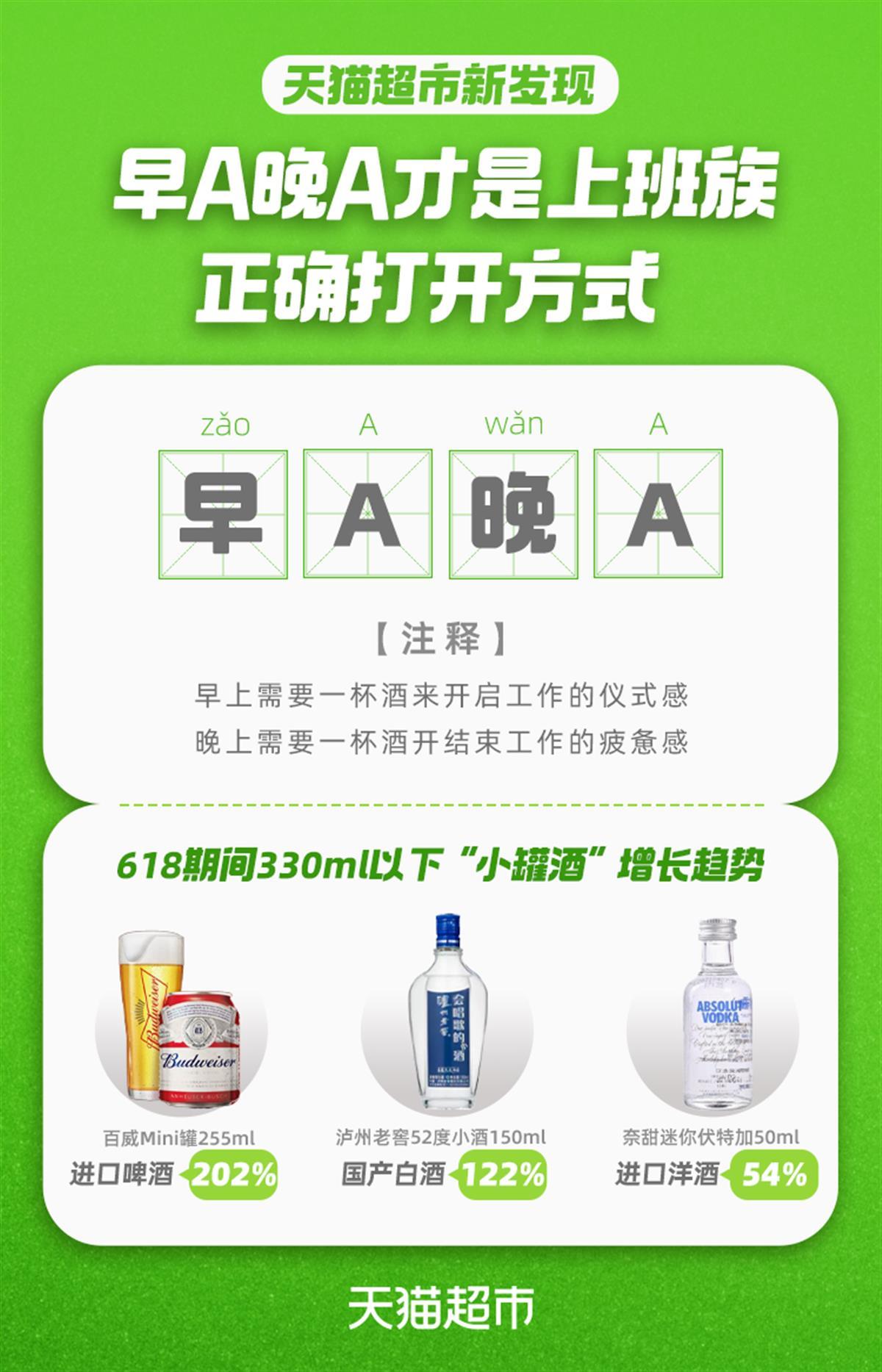 淘宝天猫618期间,天猫超市酒水销量增长强劲,其中,小罐装的酒涨幅特别明显。怎么定义“小罐酒”,包装小于330ml以下的酒,330ml是一个标准易拉罐的大小。天猫超市数据显示,330ml规格以下的进口啤酒涨幅202%,进口洋酒涨幅54%,国产白酒的涨幅是122%。