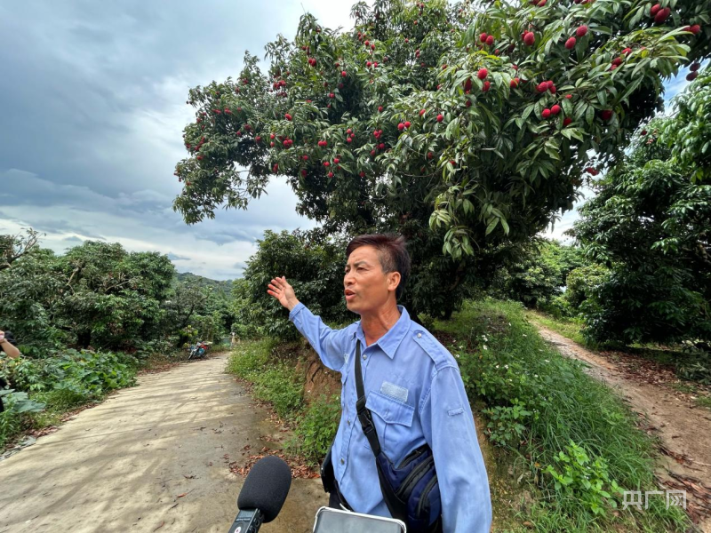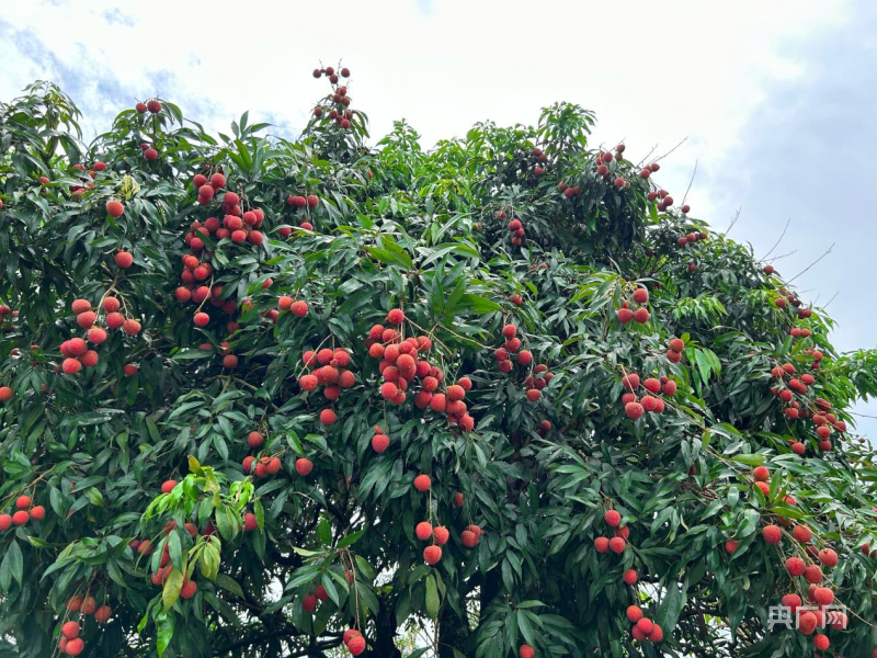 在钦北区新棠镇那黎村的一片种植基地里,鲜红的荔枝挂满枝头(央广网记者黄月芬摄)