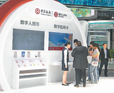 在第六届数字中国建设成果展览会现场,观众体验数字人民币消费。陈彬摄(人民图片)