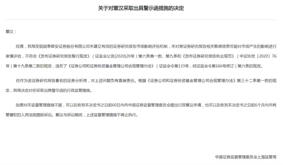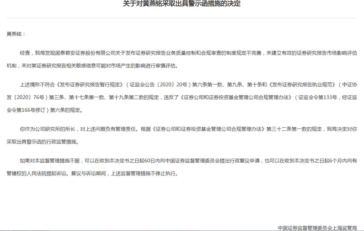 上海证监局指出,覃汉作为该证券研报署名的证券分析师,对上述问题负有直接责任;黄燕铭作为公司研究所的所长,对上述问题负有管理责任。