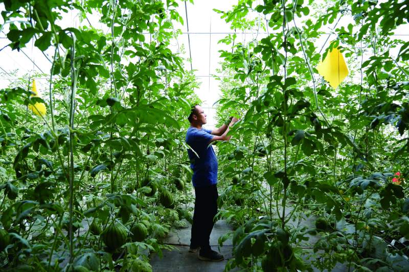 峪口镇“博士农场”工作人员查看吊秧西瓜生长情况。