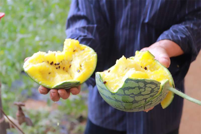 走进王辛庄镇放光村广顺高效农业园区的吊秧瓜温室大棚,一排排绿枝映入眼帘,藤蔓掩映间还点缀着一个个圆润饱满的小西瓜,不仅有常见的绿皮红瓤,还有绿皮黄瓤、绿皮橙瓤、红黄双拼色等。小西瓜“皮儿薄馅儿大”用手轻轻一拍,就直接爆裂开来,汁水四溢,果肉丰富,完全可以剥皮吃。
