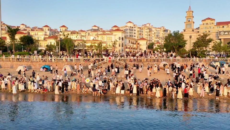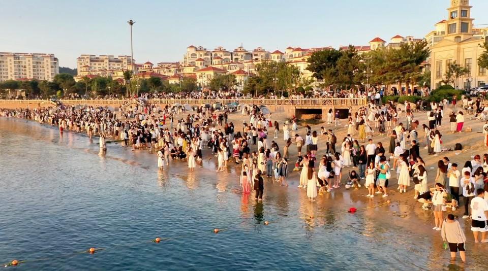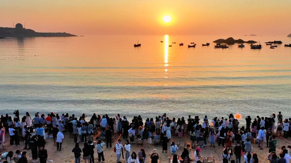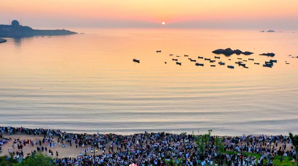 端午节假期首日,众多游客来威海欣赏海上日出