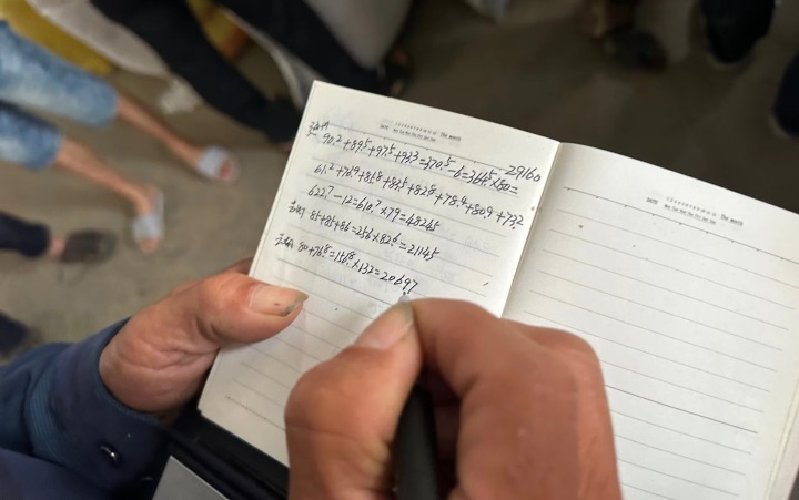 6月9日4:30,磐安县仁川镇药材收购商杨爱云早早赶到集市。潮新闻记者见到杨爱云时,她站在四五十袋浙贝母前,正按着计算器跟药农算账。装满药材的一堆白色蛇皮袋,上秤一称有500公斤。