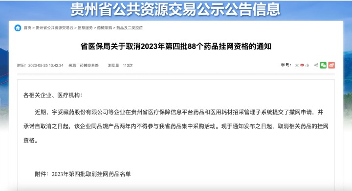 5月25日,贵州省医保局发布的一则《省医保局关于取消2023年第四批88个药品挂网资格的通知》显示,部分药企在贵州省医疗保障信息平台药品和医用耗材招采管理子系统提交了撤网申请。其中河北百善药业生产的元胡止痛片、黄连上清片,江西心正药业生产的六味地黄丸等均在取消挂网名单内。