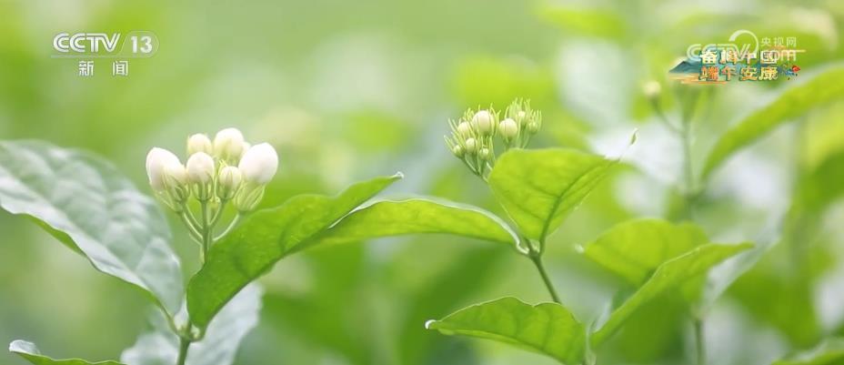 央视网消息:一天明月星河澹,满殿风吹茉莉香,夏日炎炎,暗香浮动。在福建福州永泰县的千亩茉莉花田,每年5月—11月,是茉莉花的盛放期。只见万千洁白花朵簇拥枝头,如雪落枝丫、繁星点点。花农穿行其间、指尖轻拈,采下还未展开的花芽,最终成就了闻名中外的茉莉花茶。