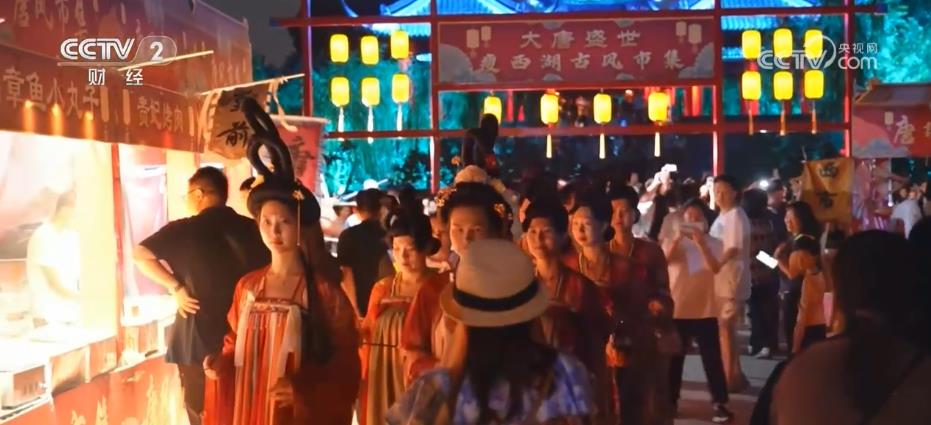 在扬州瘦西湖景区,夜幕降临、灯火璀璨、如梦如幻。在五亭桥北广场,“盛世大唐·瘦西湖唐风市集”热闹开市,吸引了众多市民、游客前来打卡。