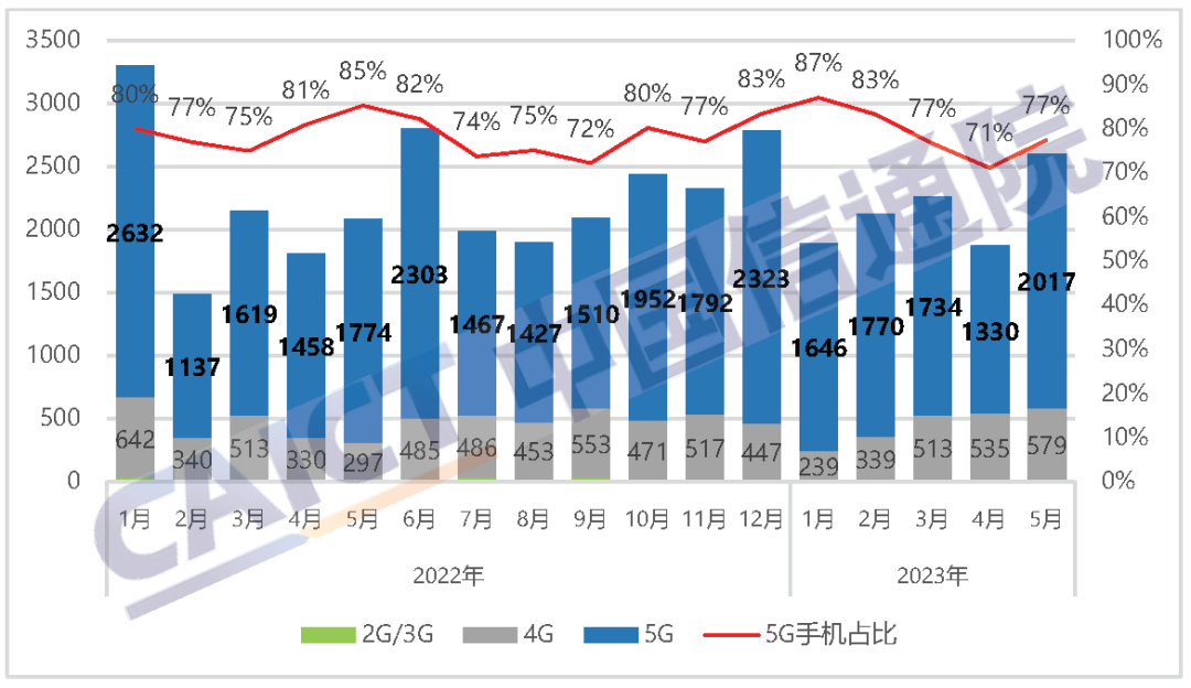 2023年1-5月,国内市场手机总体出货量累计1.08亿部,同比下降0.7%,其中,5G手机出货量8496.7万部,同比下降1.4%,占同期手机出货量的79.0%。