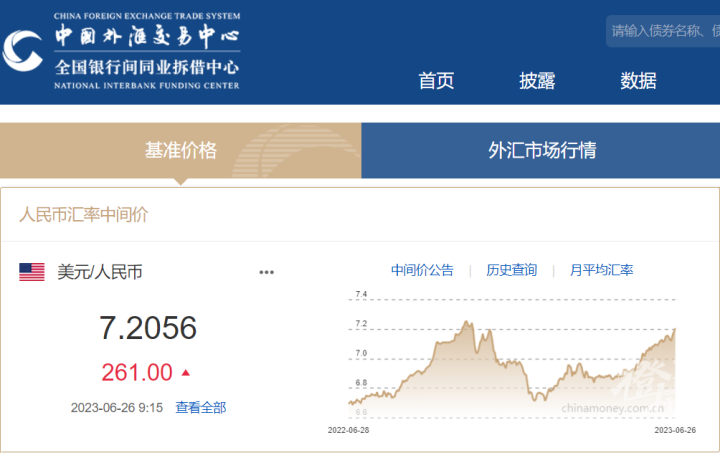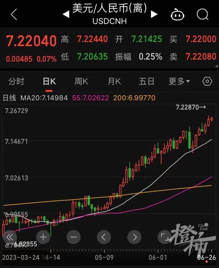 今日,离岸人民币对美元汇率跌破7.2关口,为去年11月以来首次。与此同时,中国人民银行授权中国外汇交易中心公布,6月26日人民币对美元中间价报7.2056,下调261个基点;在岸人民币兑美元汇率跌破7.23。