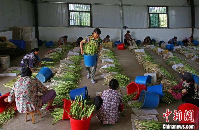 在郑标面前,一大片碧绿的芦笋茎秆笔直,翠嫩欲滴,数十名菜农熟练地将新鲜芦笋收割下来,捆扎、削根、装箱……一捆捆新鲜采摘的芦笋被装进了开往南京、上海、广东的物流卡车,当地村民依靠芦笋种植采摘及深加工产业成功步入小康。