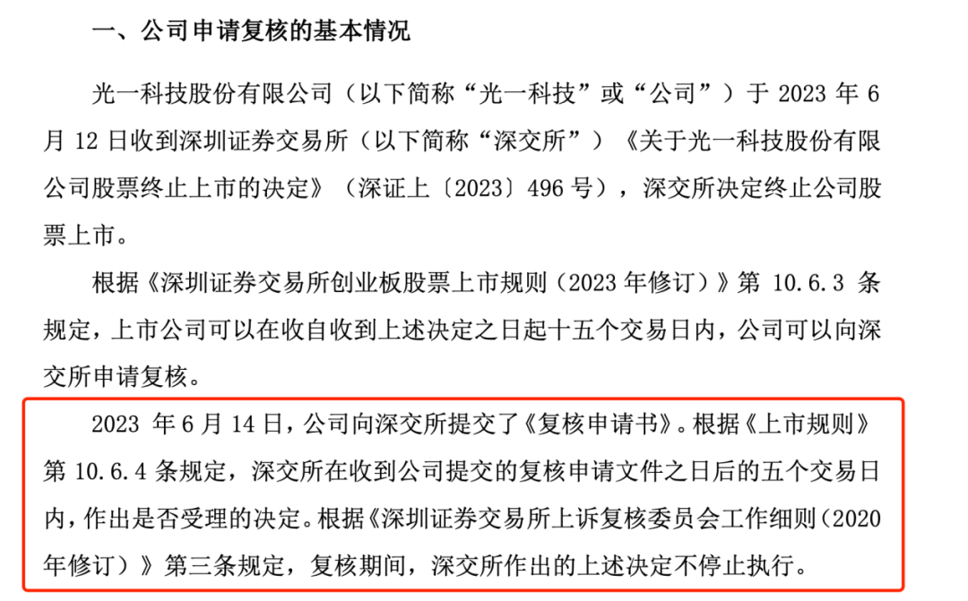 就在披露张源增持当晚,光一退也一同公告其收到深交所《复核受理通知书》。公告显示,根据《深圳证券交易所上诉复核委员会工作细则》的相关规定,现予以受理,并定于2023年6月30日召开深交所上诉复核委员会复核会议,就复核申请事项进行审议。