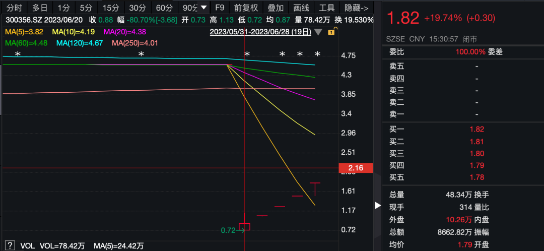 6月20日是光一退进入退市整理期交易的首日,公司股价下跌80.70%。但随后,剧情出现惊天反转——6月21日、26日、27日连续三日“一字”涨停,28日盘中上演“深V”反转。
